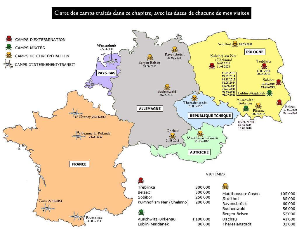 Entre 2009 et 2023, j'ai visité tous les Camps d'extermination nazis situé en Pologne, ainsi que plusieurs camps de concentration et d'internement/transit dans des pays occupés par les nazis. La carte ci-dessous regroupe tous les camps vus (19), avec les dates de mes visites. On remarque que je me suis rendu huit fois dans celui de Lublin-Majdanek ; cela s'explique par le fait que l'action de mon roman "Ania - Une enfance brisée" (du moins sa 1ère partie) se déroule majoritairement dans la Voïvodie de Lublin, située dans le du sud-est de la Pologne.